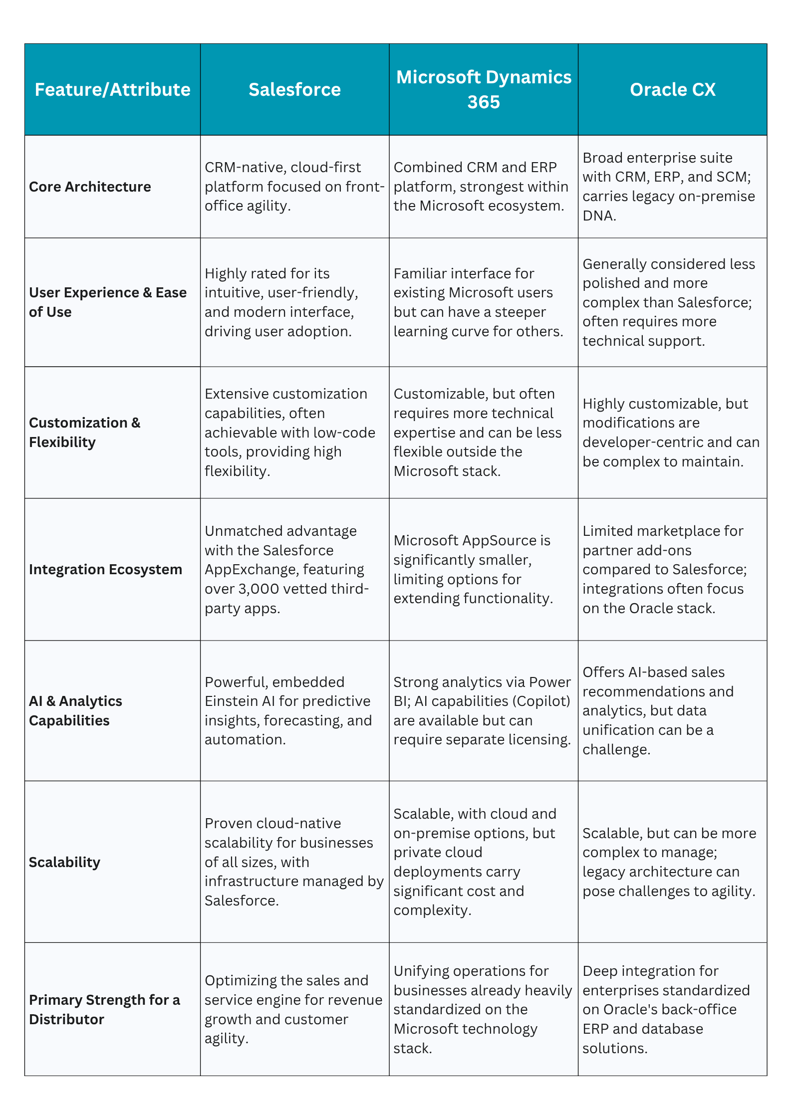 Compared to Microsoft Dynamics and Oracle CX, Salesforce’s CRM-native design prioritizes sales agility, user adoption, and front-office innovation, driving revenue for distributors.