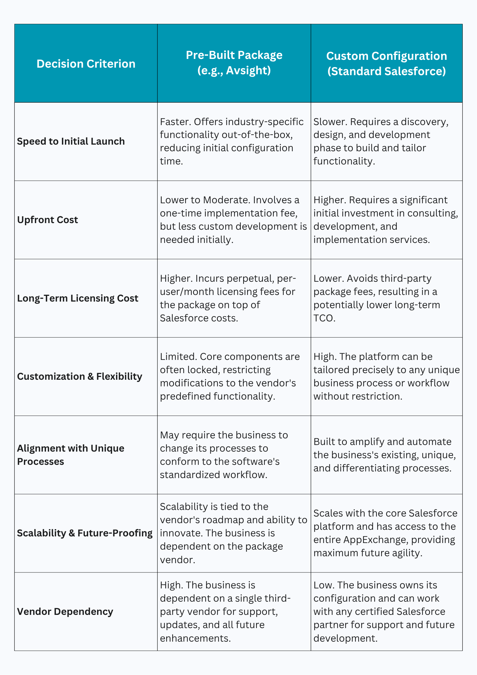 - Licensing Costs and Total Cost of Ownership (TCO): These packages require an additional licensing fee on top of the standard Salesforce licenses. Avsight, for example, lists a user subscription fee of $119 per user, per month, in addition to a one-time implementation fee. While this includes an OEM Salesforce license, it represents a perpetual operating expense that can become substantial as the number of users grows. Over a three- to five-year period, the TCO of a managed package can exceed that of a custom-configured solution.